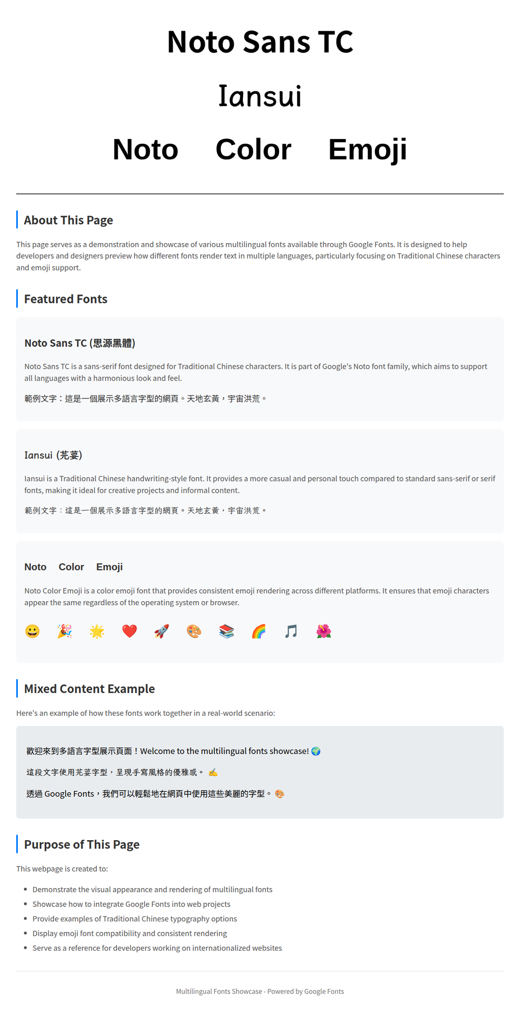 Emoji 顯示需要 Noto Color Emoji。另外強烈推薦我愛用的正體中文字體 Iansui(芫荽體)!