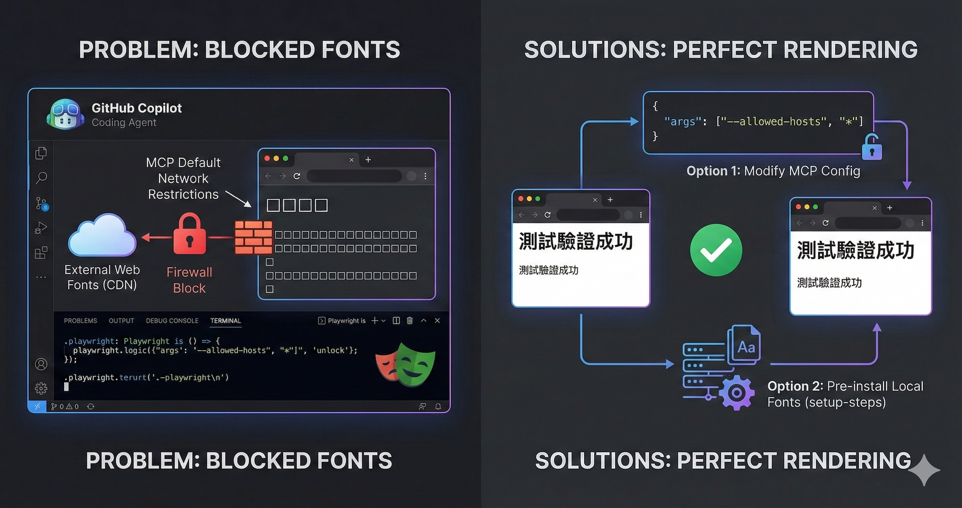 翻閱官方文件後才發現,防火牆和 Playwright MCP Server 的網路限制是兩個獨立的機制。即使防火牆放行,Playwright 預設仍只能存取本機資源。為了驗證這個理解,我建立了 test-runner-fonts 儲存庫進行系統性測試。這篇文章記錄我的發現,並提供兩種可行的解決方案。
