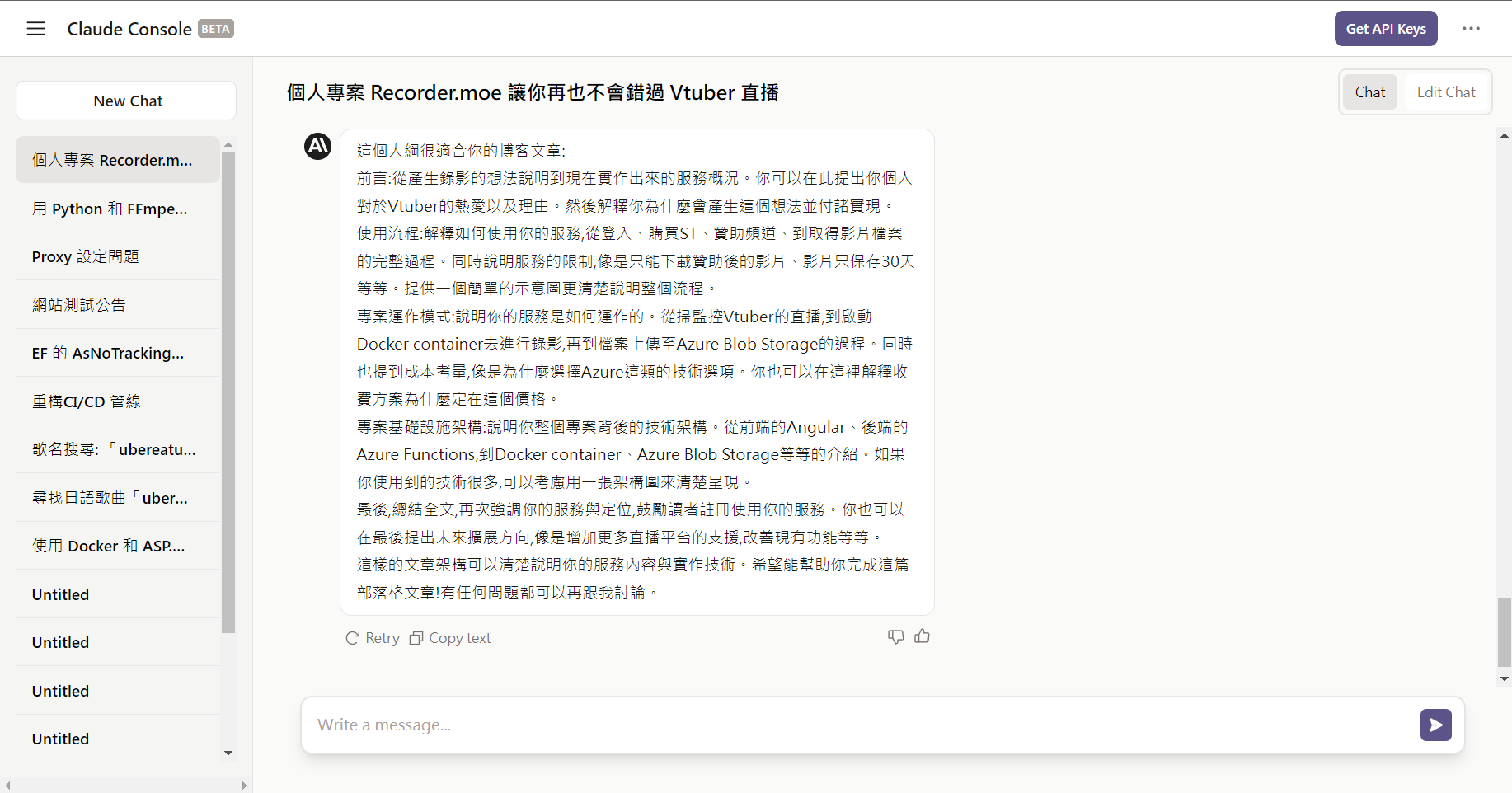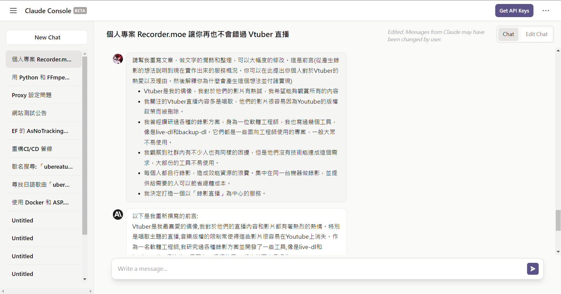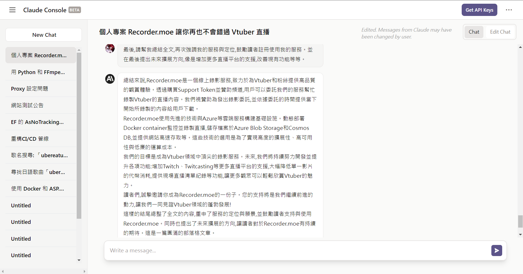 我最近完成了第一篇 AI 協助下的部落格文章—《Recorder.moe 錄影服務,讓你再也不會錯過 Vtuber 直播》。這次的寫作經驗讓我大開眼界,我想與讀者們分享這次的寫作過程。這篇文章是我第一次使用 AI 生成的初稿作為基礎,進行修改而完成的。我使用的 AI 寫作工具是 Claude,它在處理程式碼方面表現稍遜,但是在自然語言生成上有出色的表現。