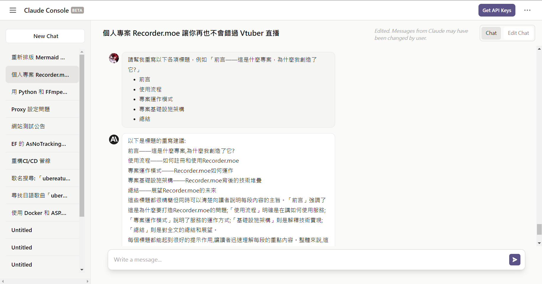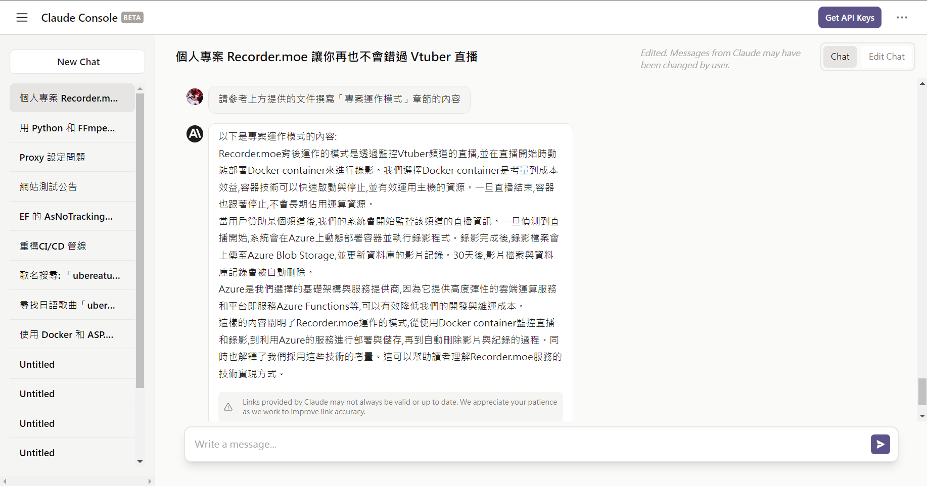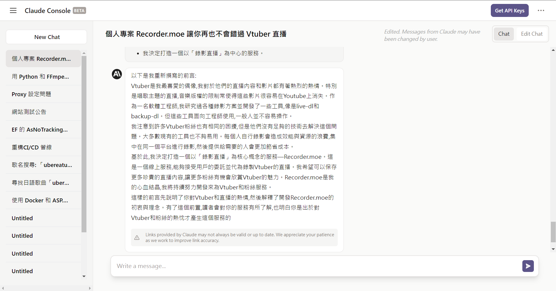 我最近完成了第一篇 AI 協助下的部落格文章—《Recorder.moe 錄影服務,讓你再也不會錯過 Vtuber 直播》。這次的寫作經驗讓我大開眼界,我想與讀者們分享這次的寫作過程。這篇文章是我第一次使用 AI 生成的初稿作為基礎,進行修改而完成的。我使用的 AI 寫作工具是 Claude,它在處理程式碼方面表現稍遜,但是在自然語言生成上有出色的表現。