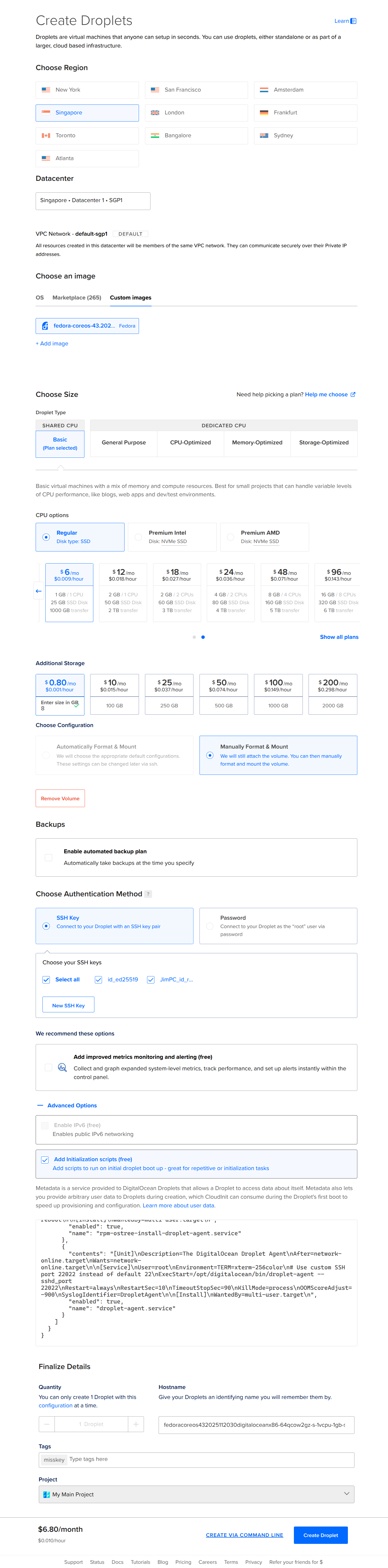 DigitalOcean 相關:帳號、SSH 金鑰、上傳 FCOS 映像檔(從 Fedora CoreOS 下載頁面 取得 DigitalOcean 版本,參考 官方 DigitalOcean 部署文件)