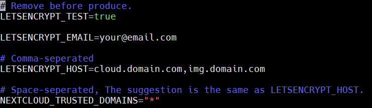cp .env_sample .env && vim .env環境變數 說明 LETSENCRYPT_TEST 此為設定申請測試 SSL 證書,現在給 true,最後上線前才改 false LETSENCRYPT_EMAIL Let's Encrypt 在證書到期時通知你用的 email,不會透過這個做驗證。但這也是你對網域的申報,建議正確填入。 LETSENCRYPT_HOST SSL 證書網域名稱和別名。以半型逗點「,」分隔,不能用 wildcard NEXTCLOUD_TRUSTED_DOMAINS Nextcloud 的信任網域,這是一個安全性設定,以其它的網域訪問 Nextcloud 時會被擋住。 建議和 LETSENCRYPT_HOST 填入相同內容但以空白分隔,或可用「*」wildcard 字符。 需注意,填入後若要消除,必須到 nextcloud container 下的 /var/www/html/config/config.php中做消除。 此處設定只寫不消,且只在第一次建立 Nextcloud 設定檔時會讀取。填入 db.env 檔案