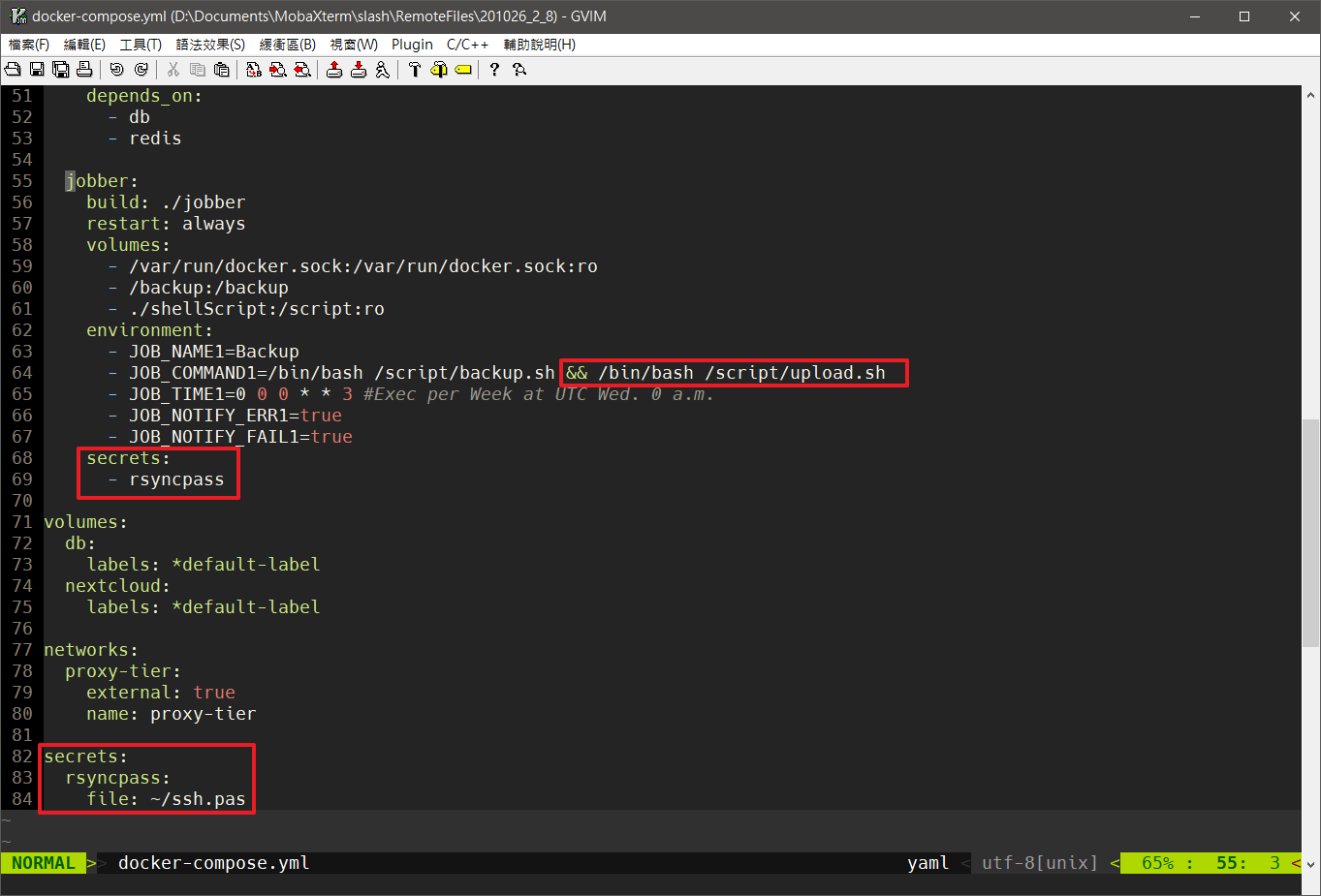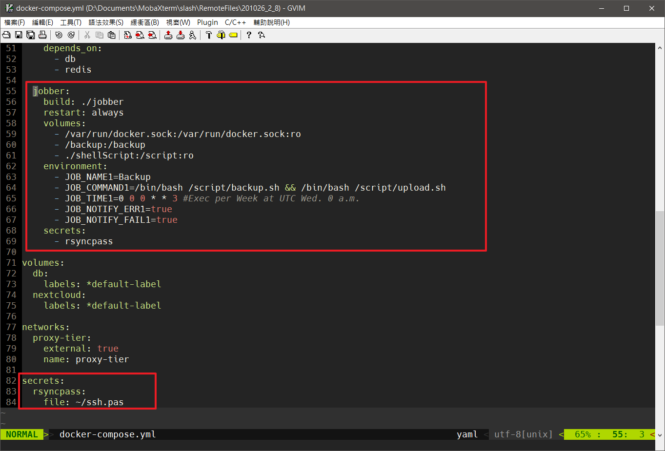設定了上機時會跳過創建主帳號程序,直接開始 Nextcloud 初始化環境變數 說明 NEXTCLOUD_ADMIN_USER 創建你要用的 Nextcloud 帳號 NEXTCLOUD_ADMIN_PASSWORD 創建你要用的 Nextcloud 密碼 修改 jobber 部份: