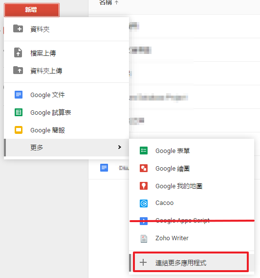 請進入你的 Google 雲端帳號,在左上角選擇 "新增"→"更多"→"+ 連結更多應用程式"
