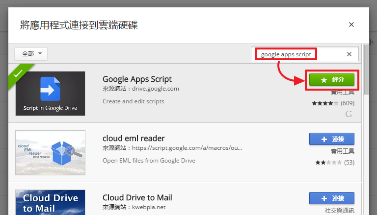 在右上角搜尋 "Google Apps Script",點下 "+ 連接"
