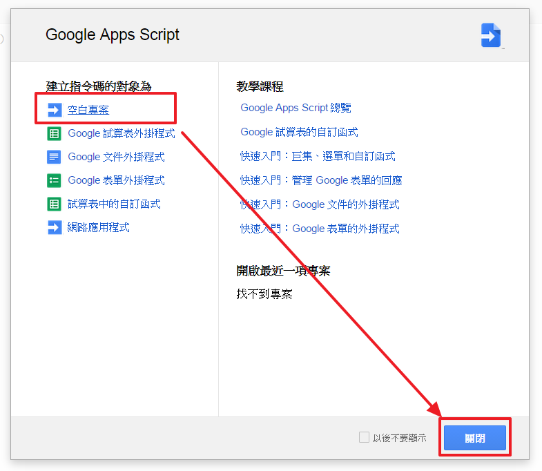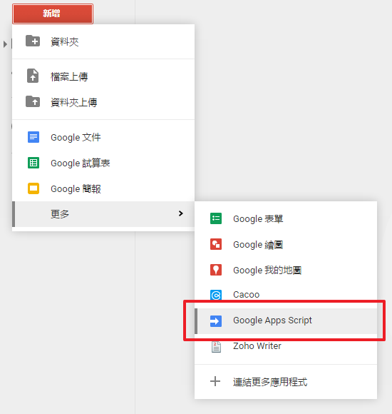 連接後,回到這裡應該就會有選項出來,新增一個 Google Apps Script