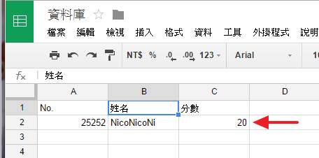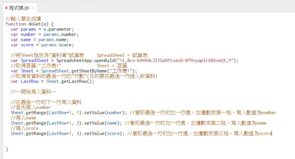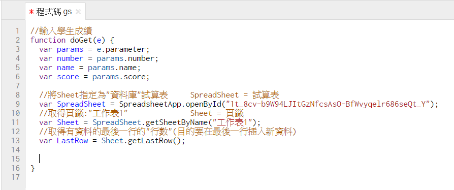 Sheet.getRange(LastRow+1, 3).setValue(score); //意即最後一行的加一行處,左邊數來第三格,寫入數值為score