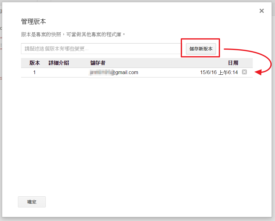 點擊 "儲存新版本" 以後會多出一條,請記住你發布的版本號
