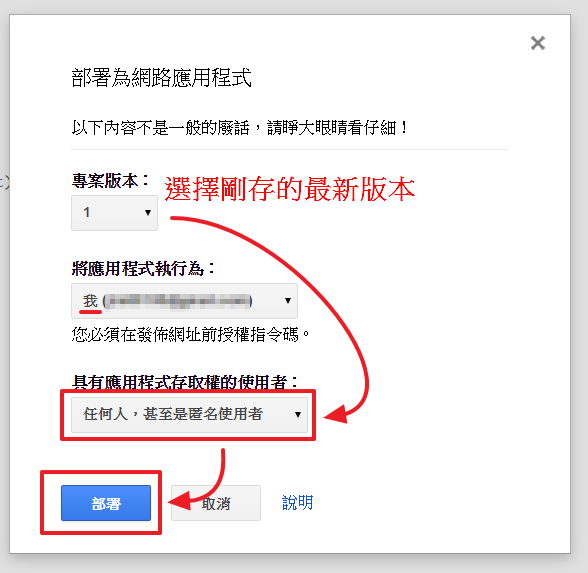 此處請選擇 "剛剛的版本號"、執行者是 "我"、權限授權給 "匿名"