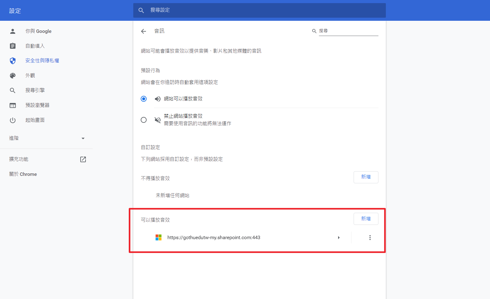 來到此頁面 chrome://settings/content/sound ,在最下方的「可以播放音效」添加要允許自動播放的網站