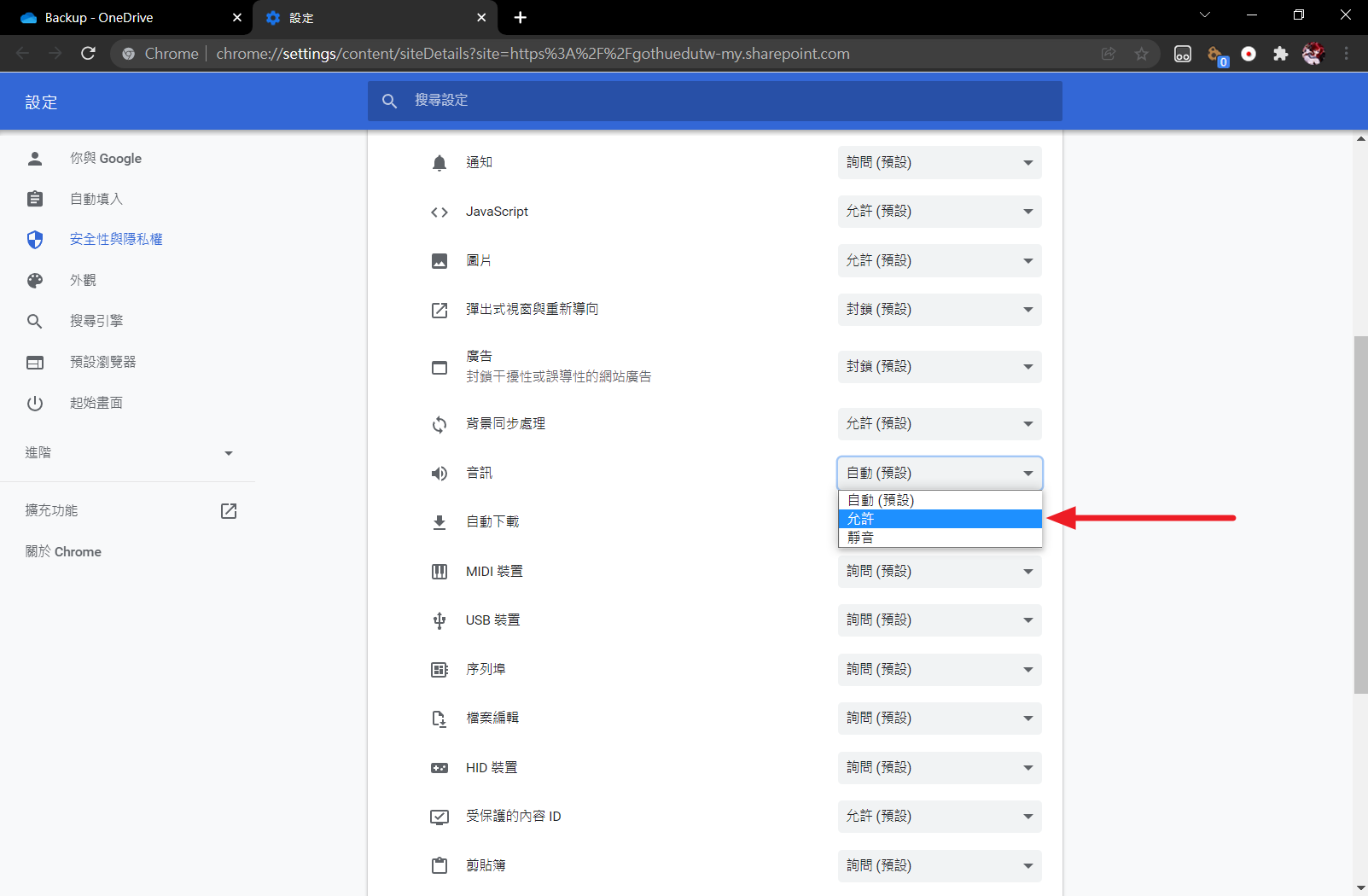 在 siteDetails 頁往下捲,找到 🔊音訊 ,選擇允許