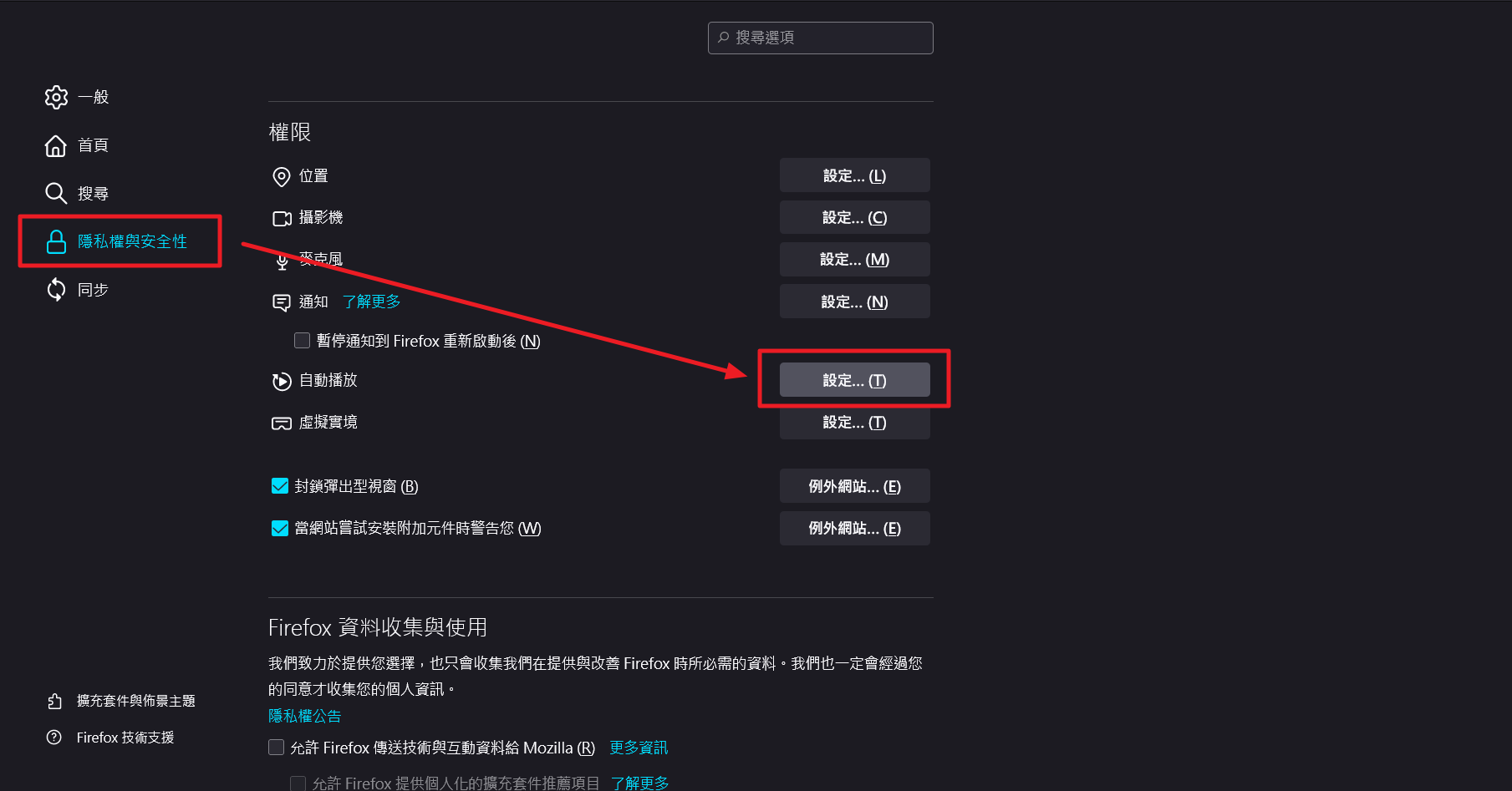 來到設定的「隱私與安全性」頁面 about:preferences#privacy ,下拉到「自動播放」,點右側「設定」
