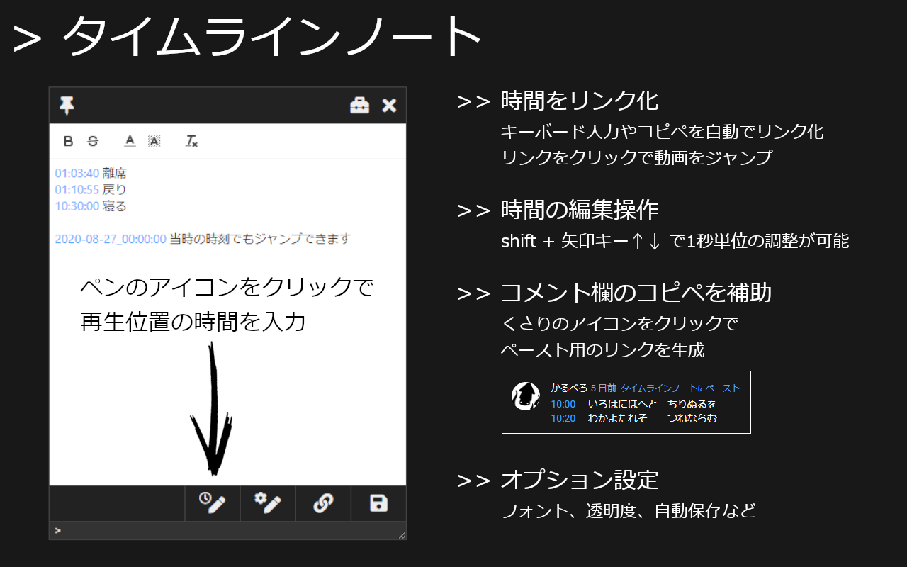 它的次要 (?) 功能是,一個很強大的時間軸筆記工具,還附有一個總覧介面。很適合用在歌枠打歌單時軸,或是烤肉 man 剪精華筆記之類的。