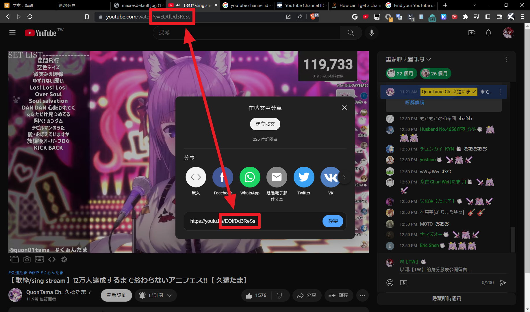 - 在網址列上找 v 參數,或是點擊「分享」的網址最後一段