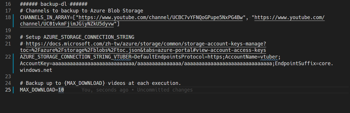 vim .envCHANNELS_IN_ARRAY: Azure Blob Storage 的連接字串AZURE_STORAGE_CONNECTION_STRING_VTUBER: 欲下載的頻道網址,以陣列傳入HOST: WebUI 網址MAX_DOWNLOAD: (可選) 每次執行的最大下載數量,預設為 10FORMAT: (可選) 自訂欲下載的格式,預設為 bestvideo+bestaudio/best,請參考 yt-dlp 說明文件