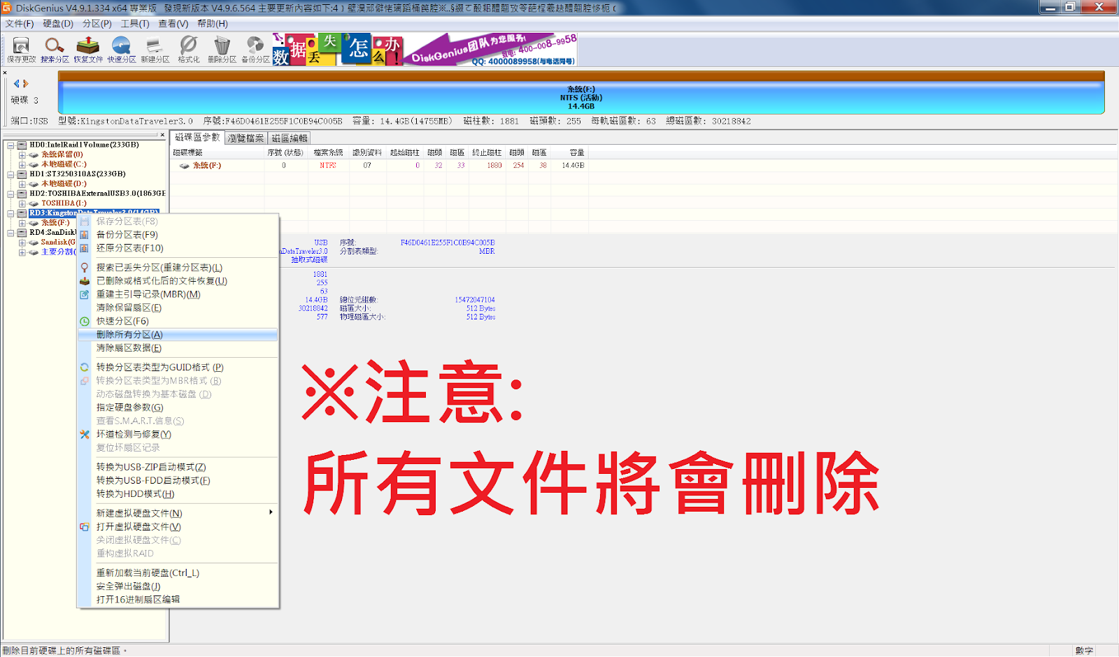 開啟 DiskGenius,USB 磁碟上右鍵,清除所有分區