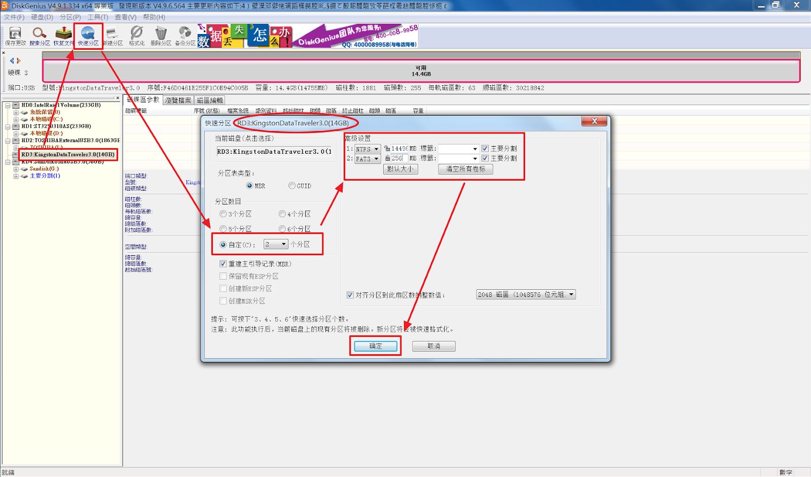 選擇磁碟後,使用快速分區,確認圓圈處沒有選擇錯誤,創建 2 個分區 ,設置分割區如下