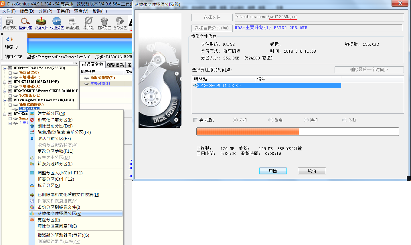 選擇第二個 FAT32 分區,右鍵「從鏡像檔還原分區 」,倒進這裡提供的 uefi256M.pmf