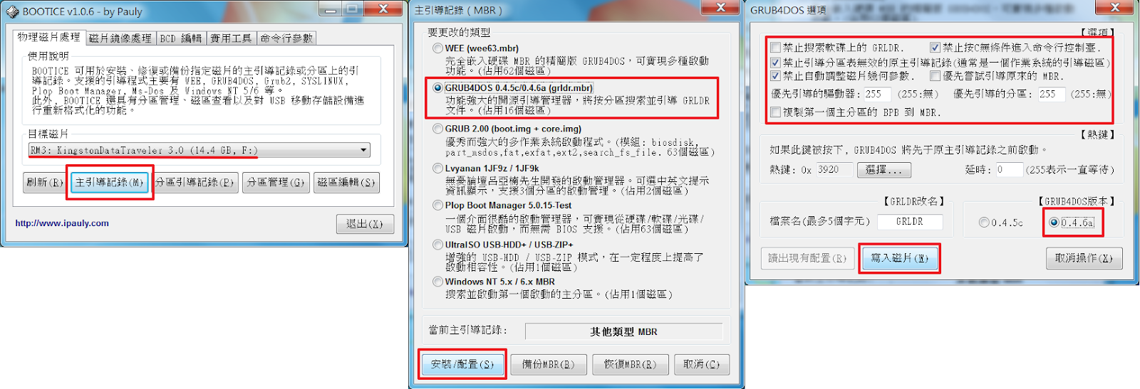 開啟 BOOTICE,選擇到目標 USB,主引導記錄,選擇 Grub4dos0.4.6a,其餘設置如圖,寫入磁片
