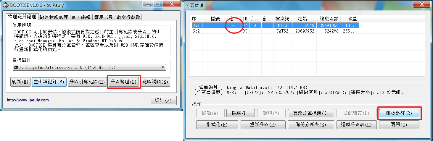 BOOTICE 分區管理,將自動掛載的盤符刪除