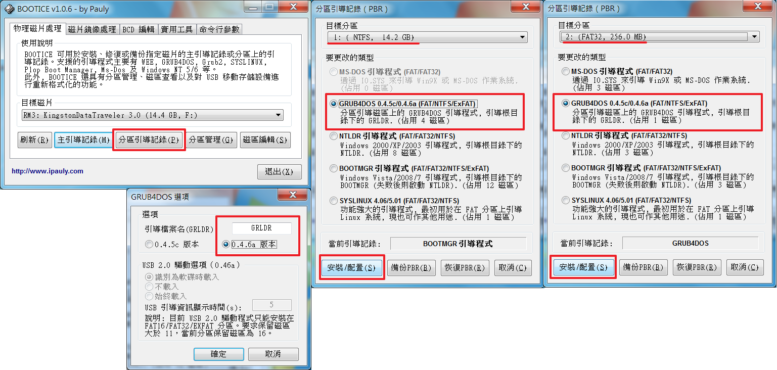 BOOTICE 分區引導記錄,選擇 Grub4dos 0.4.6a,兩個分區都要修改