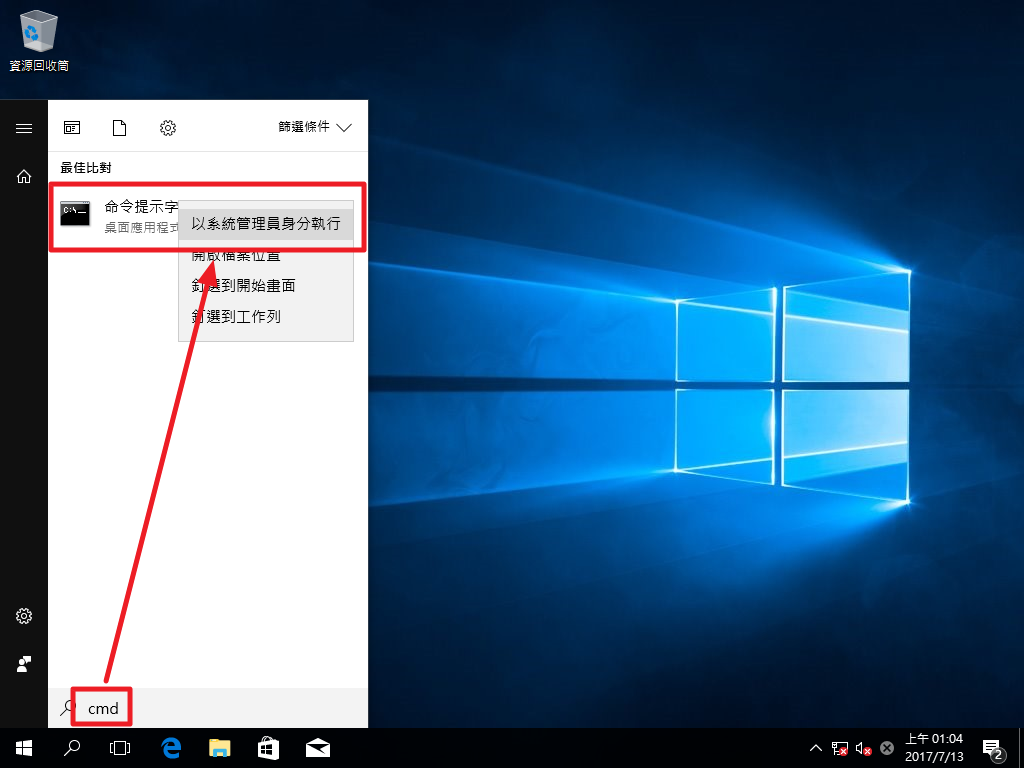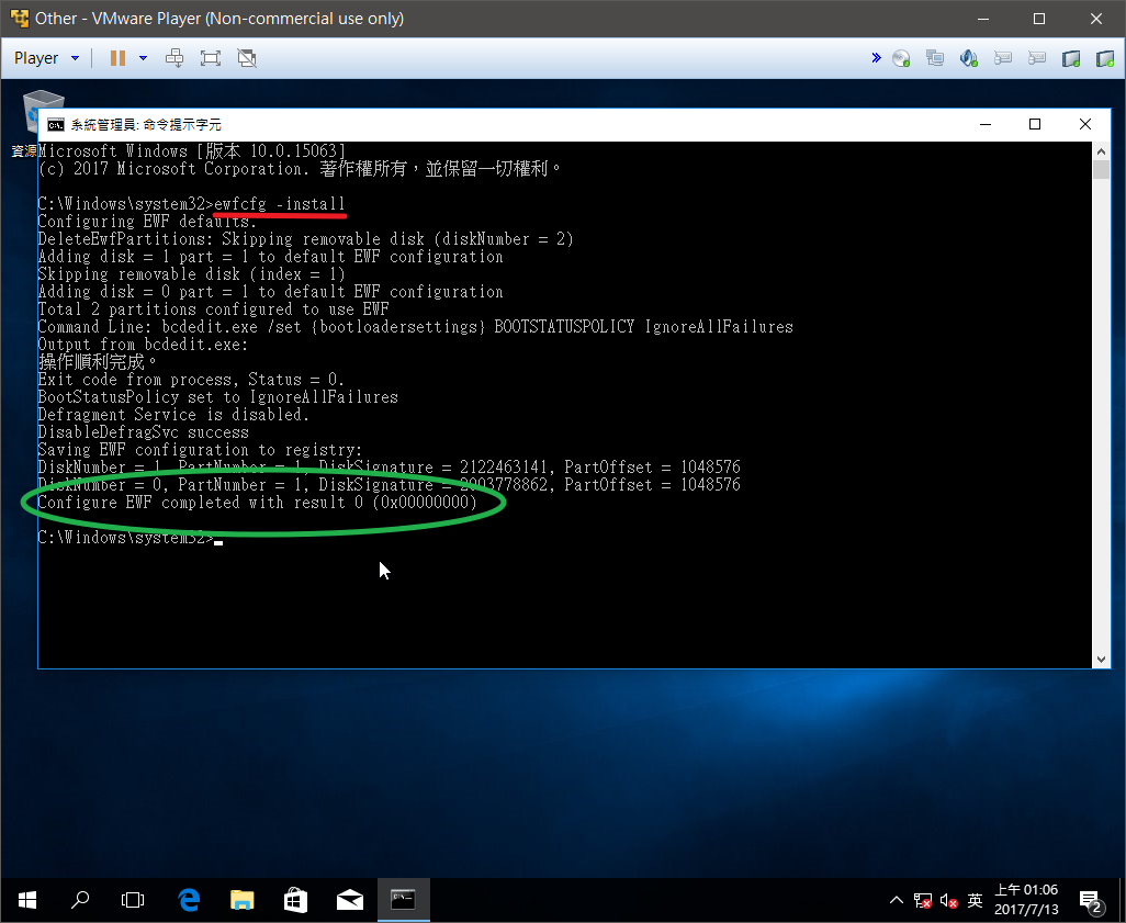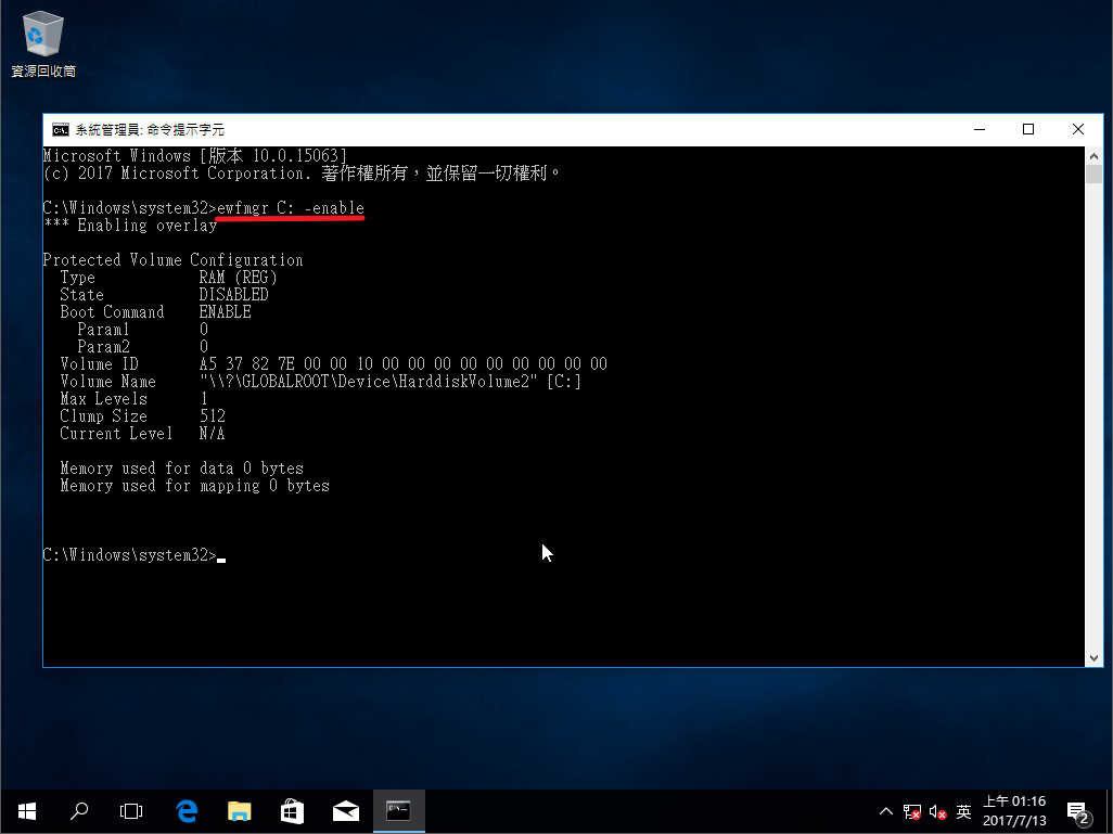 再次系統管理員開啟 cmd,執行 "ewfmgr C: -enable"