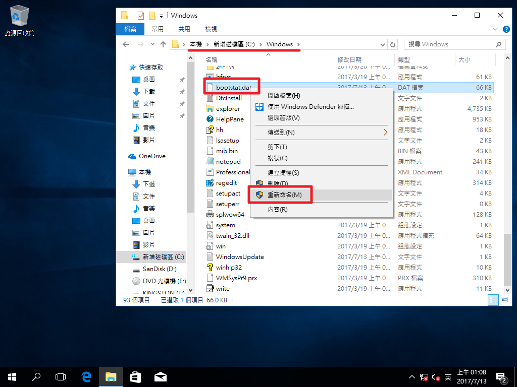 到 C:\WINDOWS 下將 "bootstat.dat" 重新命名為 "bootstat.dat.old"