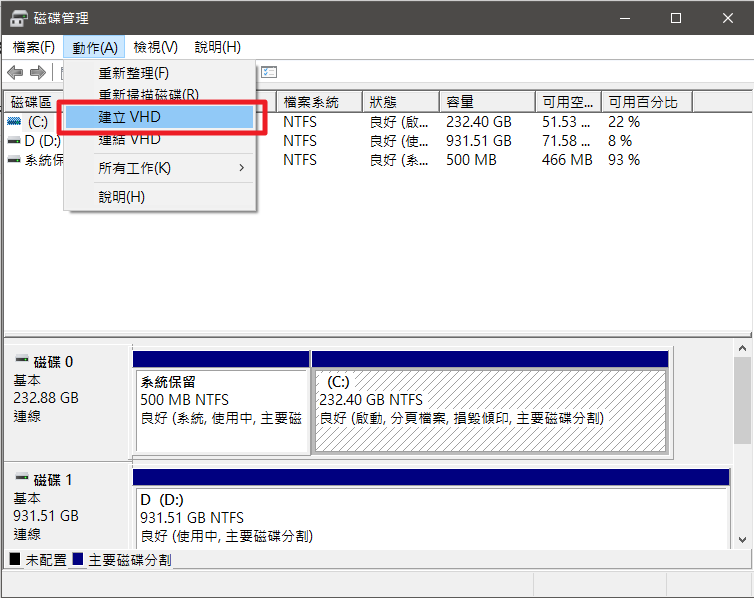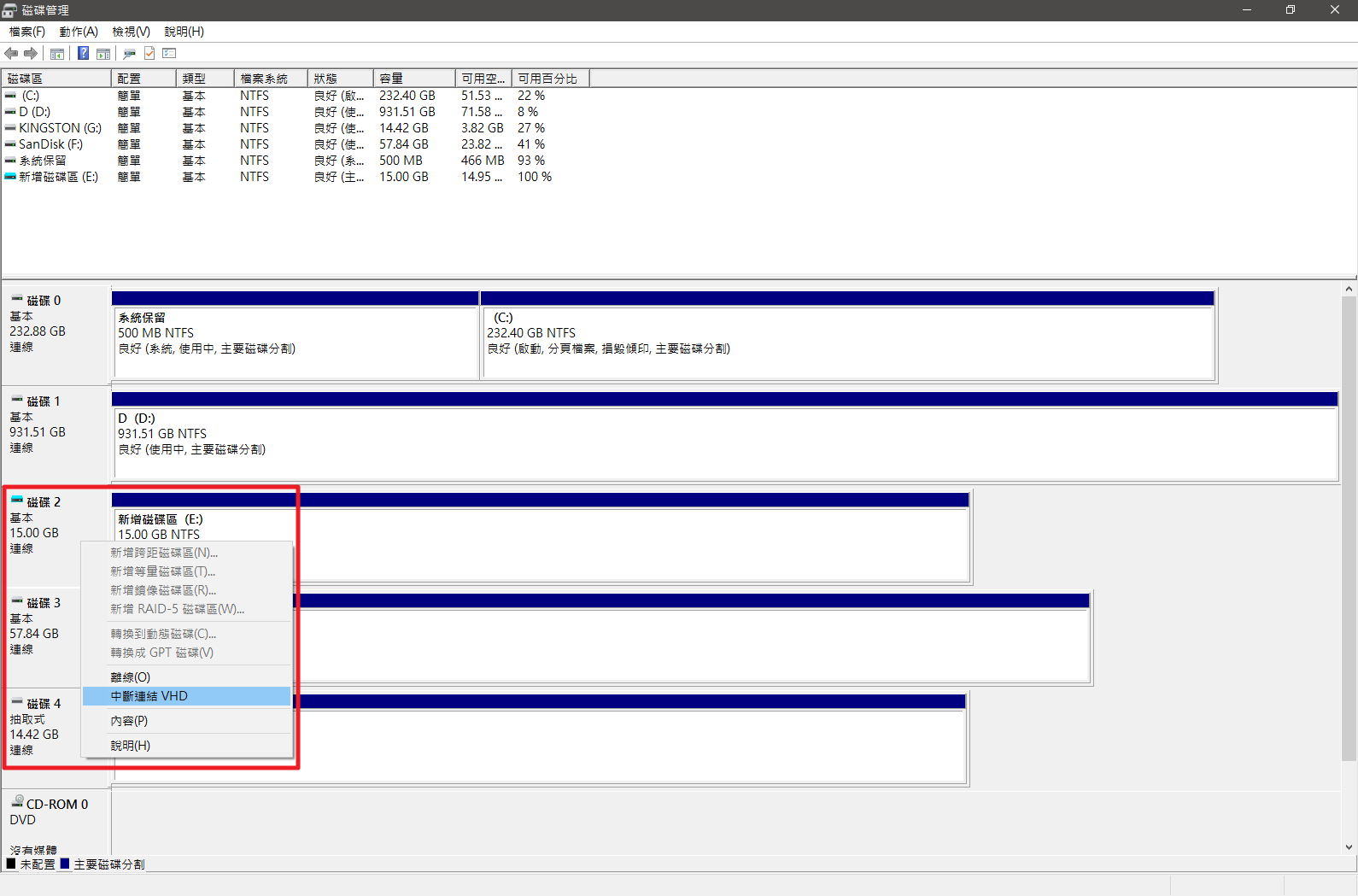 卸載 VHD,對著 VHD 左半邊右鍵→中斷連結