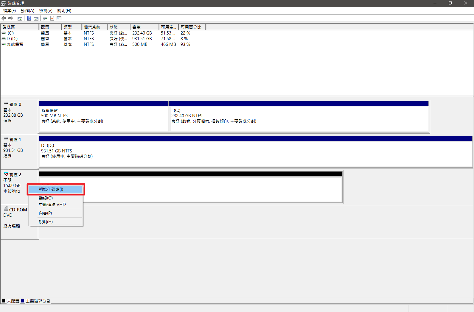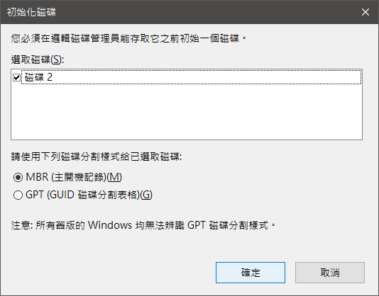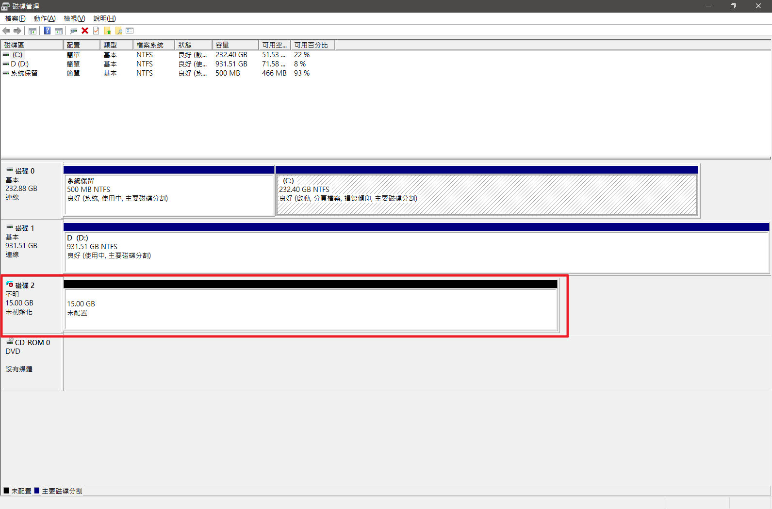 建立完成後應該會自動連結 VHD,會出現未初始化 VHD