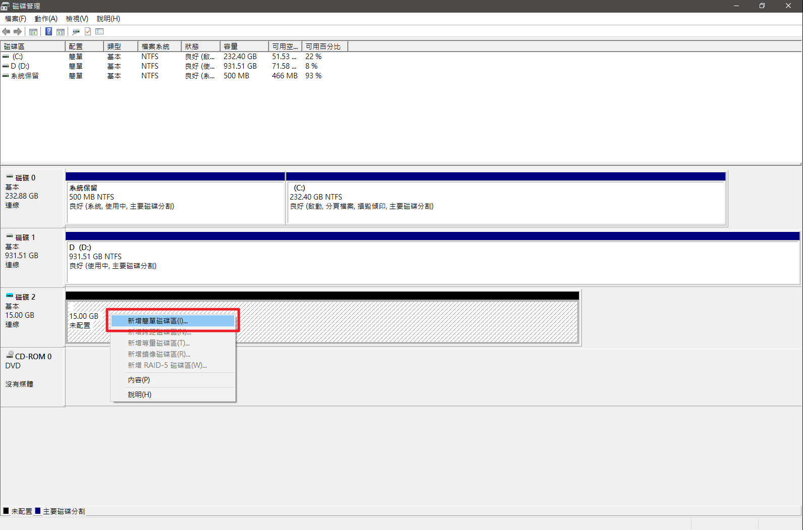 Win+R 打開執行,輸入 "diskmgmt.msc" 打開磁碟管理員
