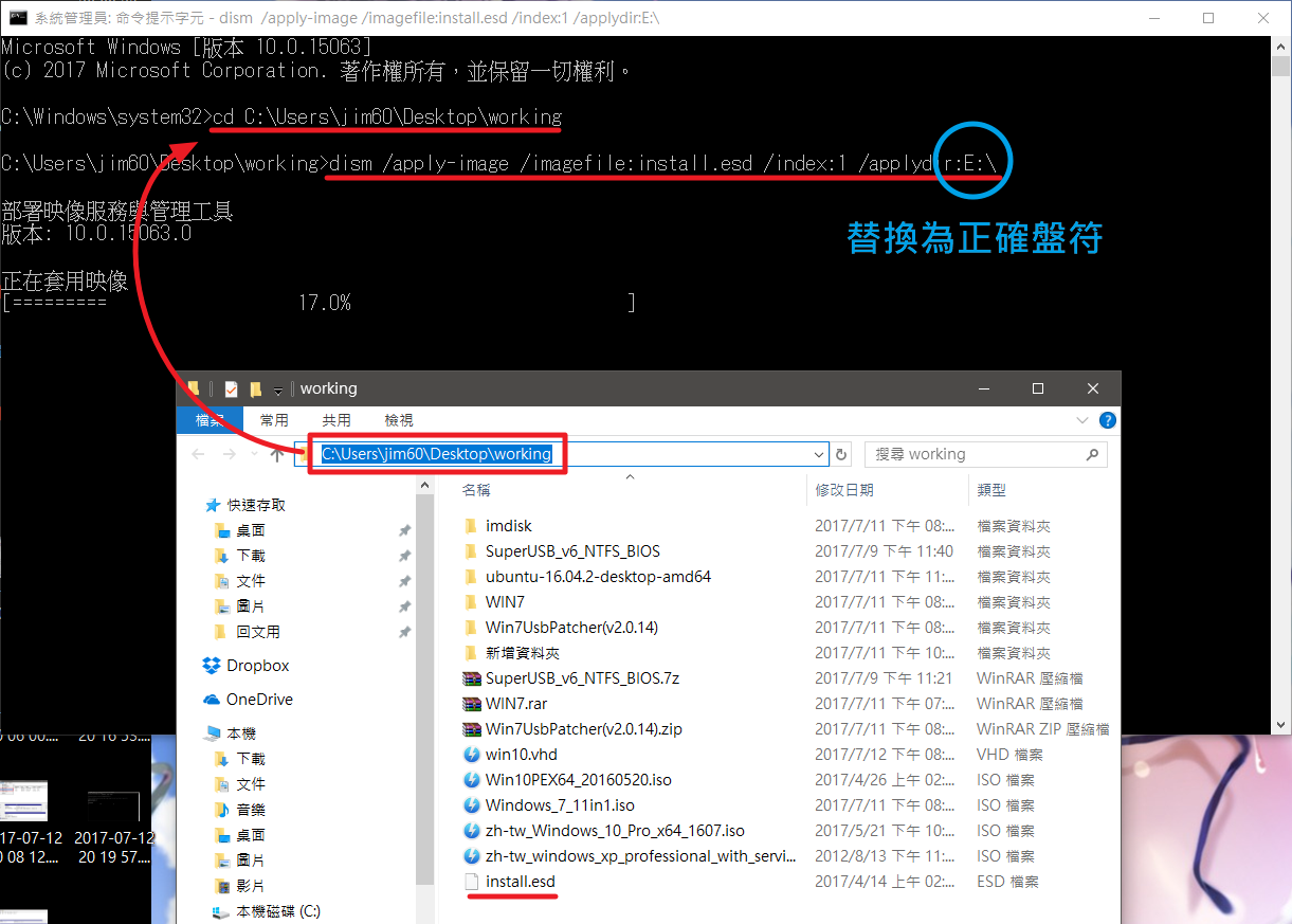 先 cd 到 install.esd 所在目錄: cd C:\Users\jim60\Desktop\working (視你的檔案位置而定)