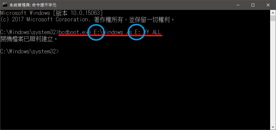 接下來要建立 BCD 引導: bcdboot.exe E:\windows /s E: /f ALL (替換成你的 15G VHD 掛載盤符)