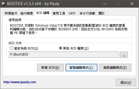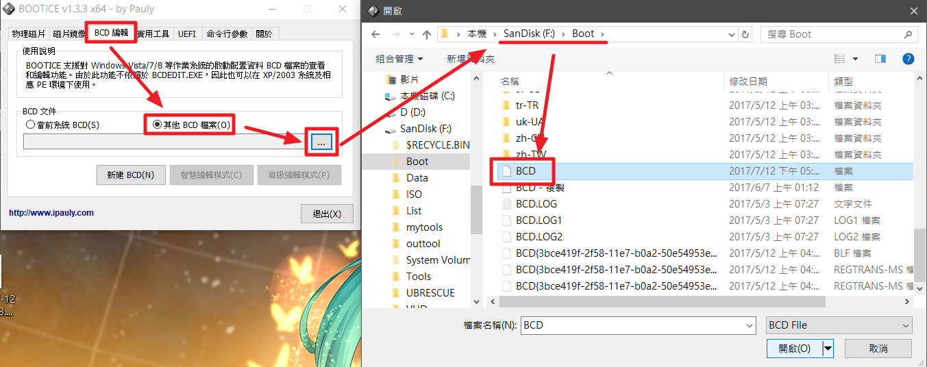 開啟 BOOTICE→BCD 編輯→其他 BCD 檔案→...→選擇到 USB:\Boot\BCD