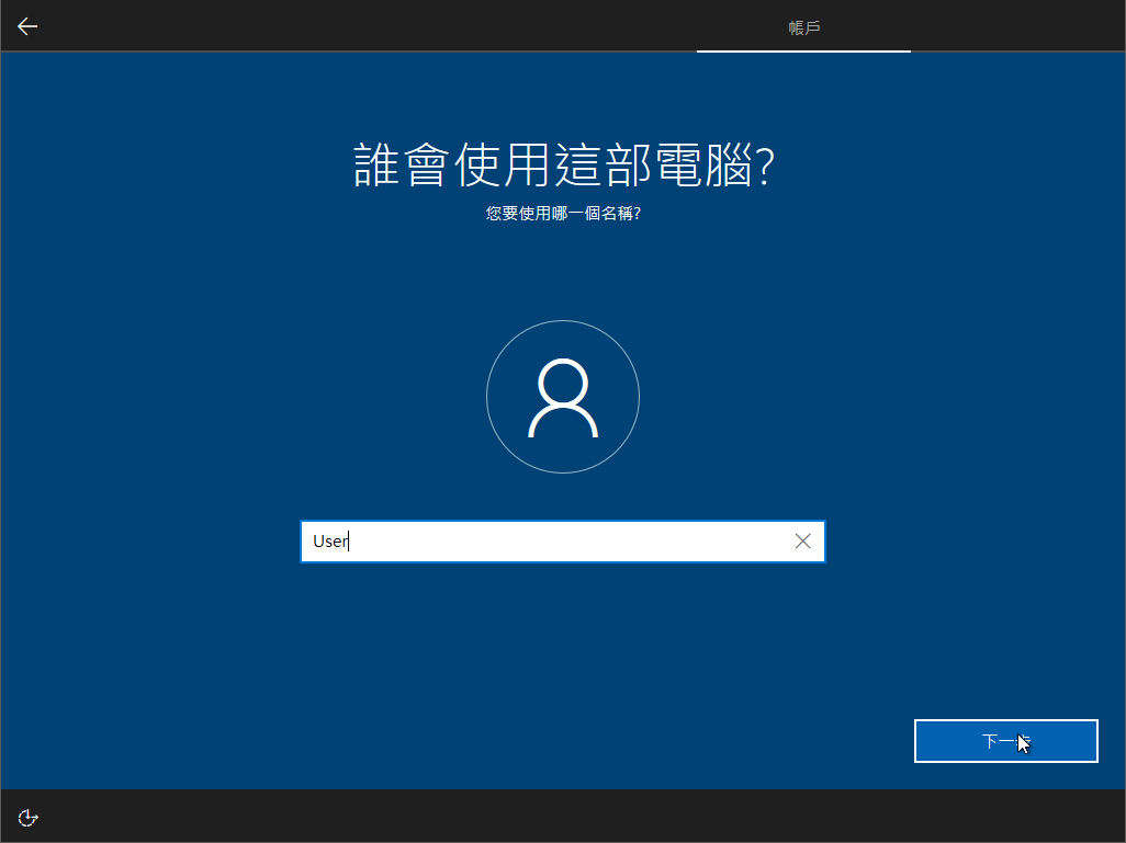建立使用者,使用者名稱 "User",密碼空著直接下一步