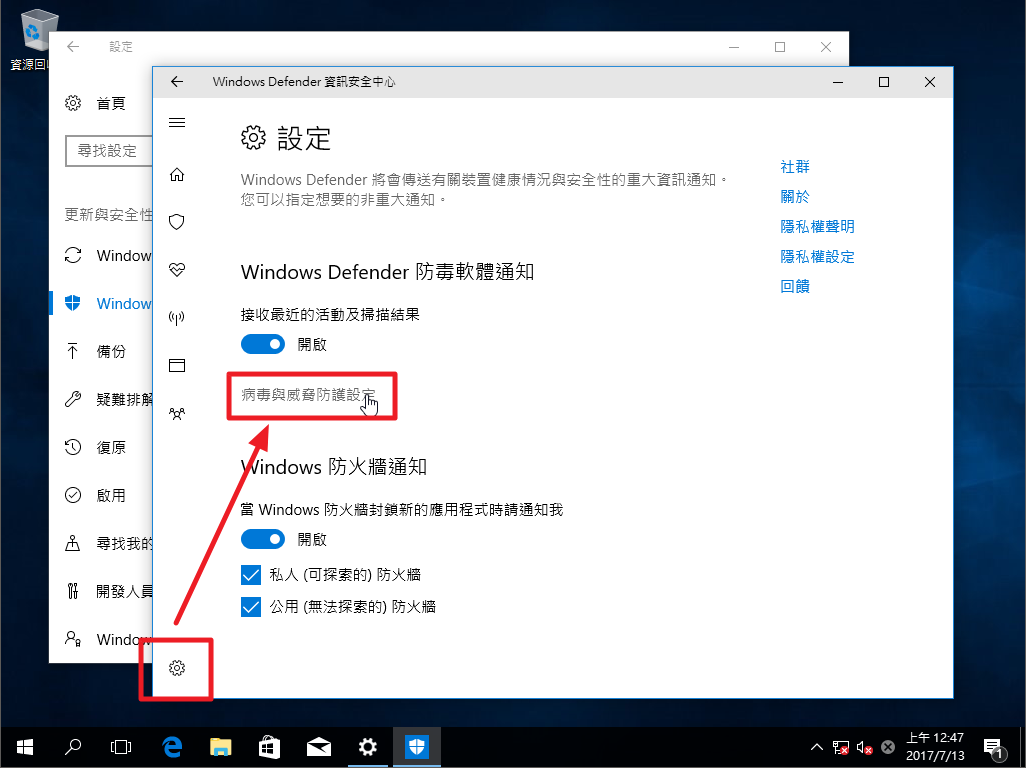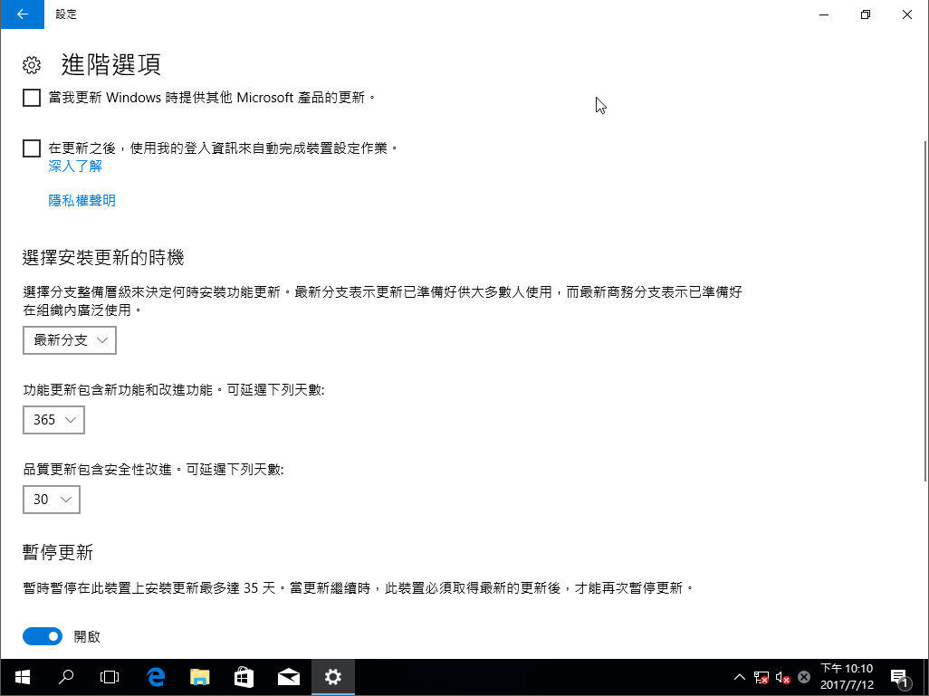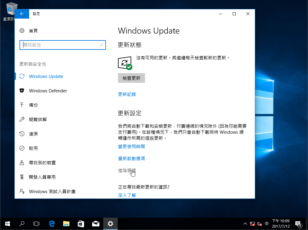 左下角工具列右鍵→設定→更新與安全性→進階選項
