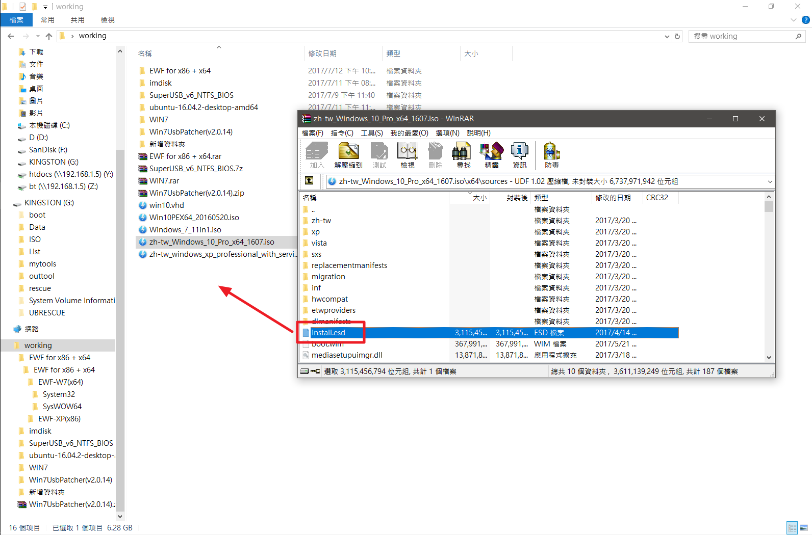 將 Windows10 安裝光碟用 WinRAR 打開,找到 "\x64\sources\install.esd",解壓縮出來