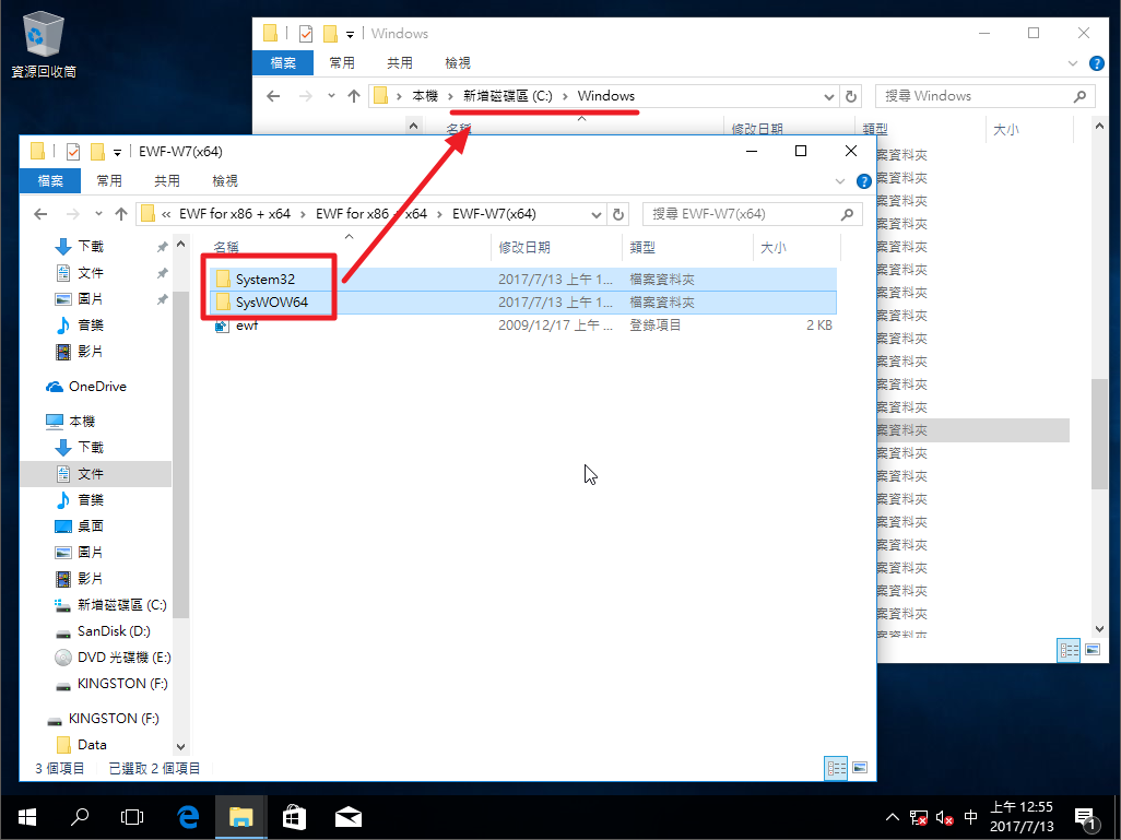 把 "\EWF for x86 + x64\EWF for x86 + x64\EWF-W7 (x64)" 資料夾下的 "System32"、"SysWOW64" 兩個資料夾複製到 "C:\Windows" 下