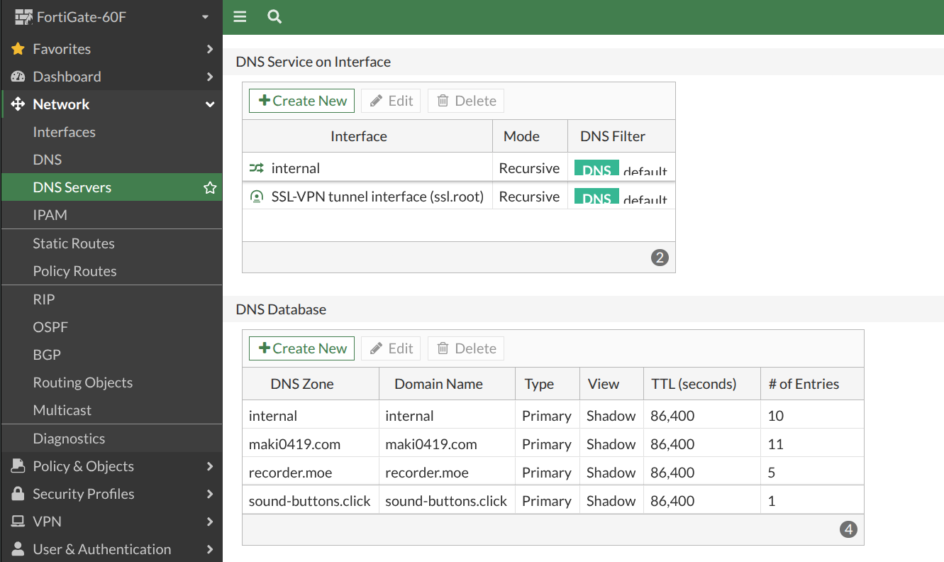 我在 FG-60F 上啟用 DNS 伺服器,主要是為了設定內部網域解析。我將外部網域名稱對應到內部 IP,這樣由內部存取時就不會走到外頭去繞一圈,能直接在 Mikrotik 交換器內完成轉發。它的上游 DNS 我使用 1.1.1.1。